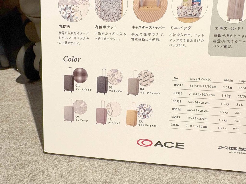 - 内装のデザインが外装の色ごとに異なり、付属のアクセサリーも内装と同じ柄で揃えられています。