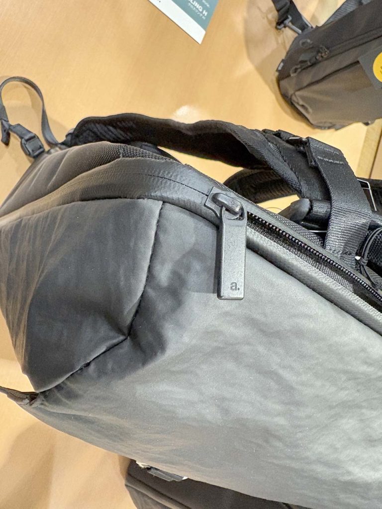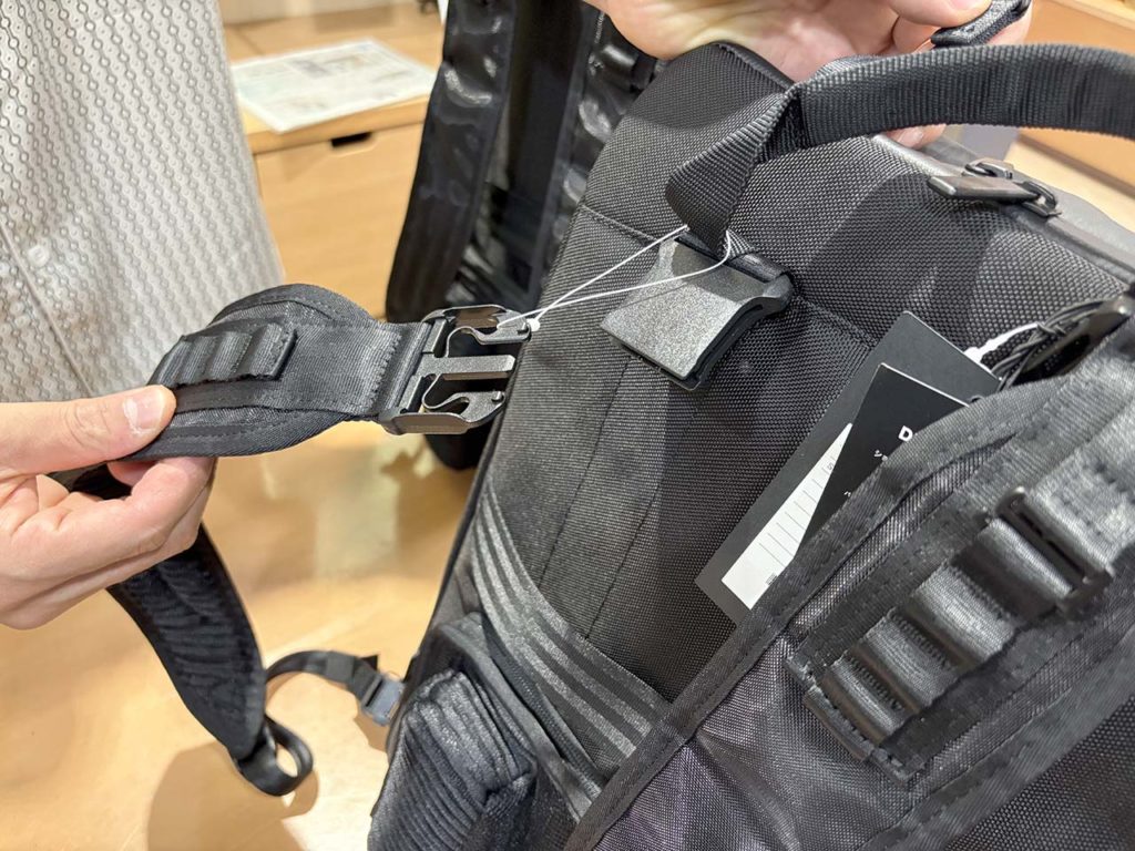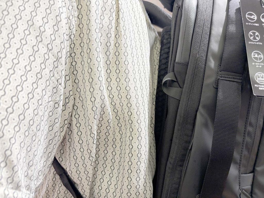 そして、もう一つの見逃せないポイントが、本体生地の高い撥水性です。突然の夕立に見舞われても、表面のコーティング生地が雨を弾いてくれるので安心。特にMacBookなどのPCを持ち運ぶ方にとっては、これはもはや必須スペックと言えるでしょう。大切な荷物を雨からしっかり守ってくれます。
