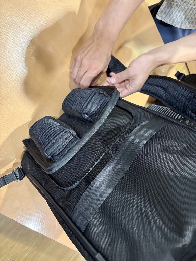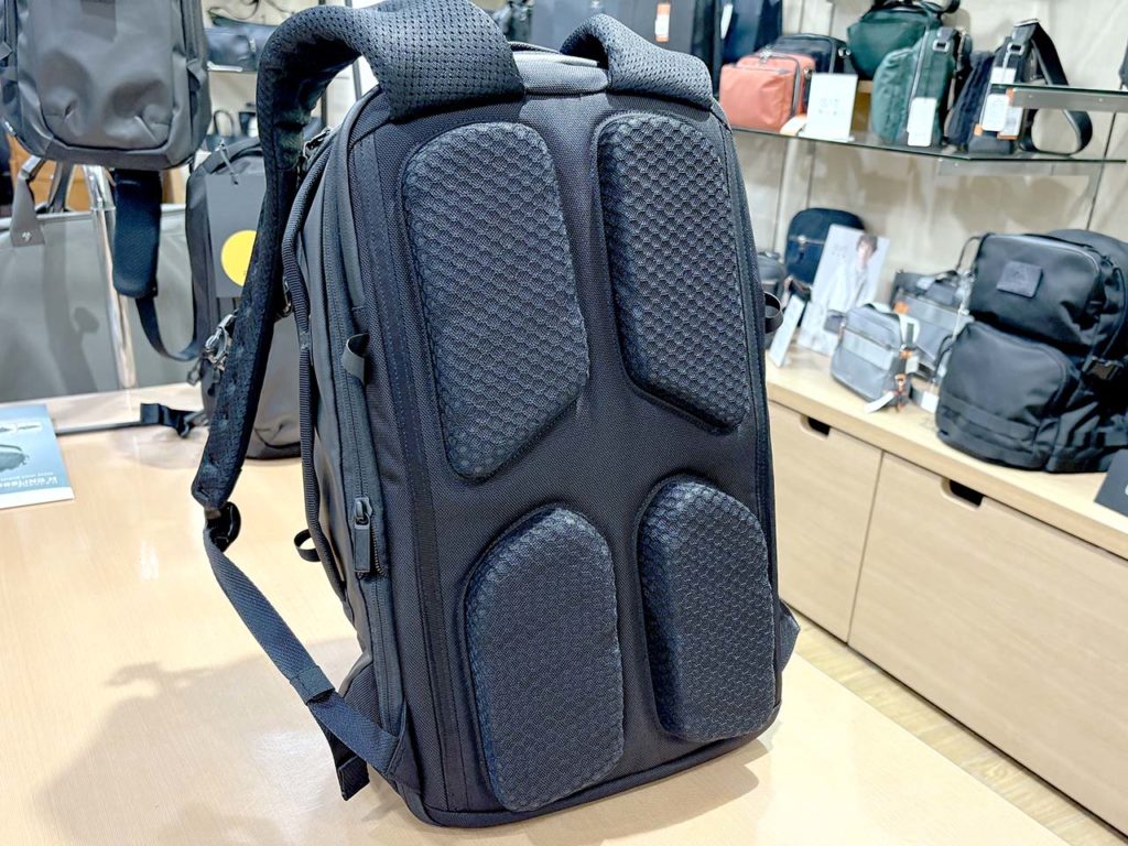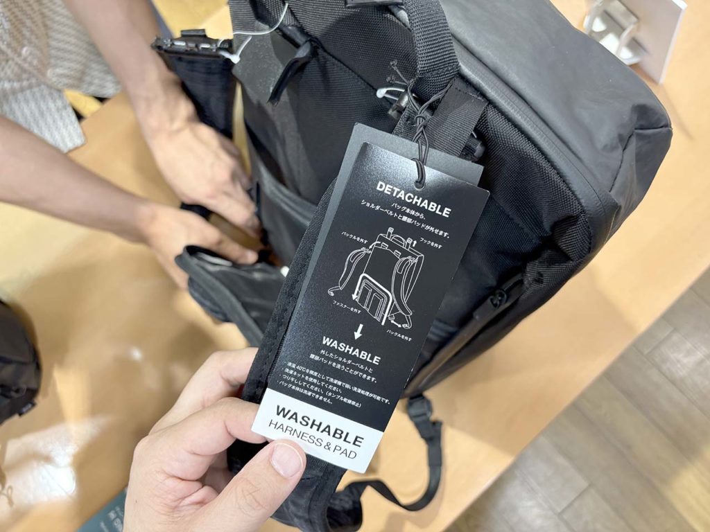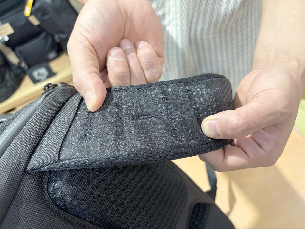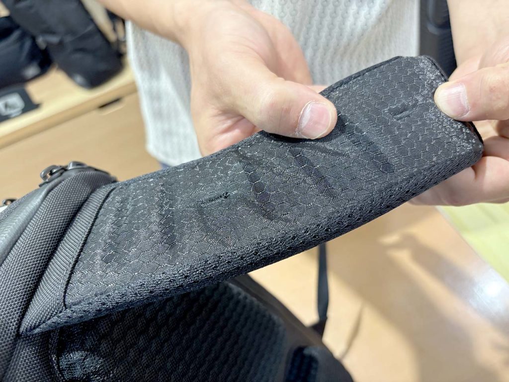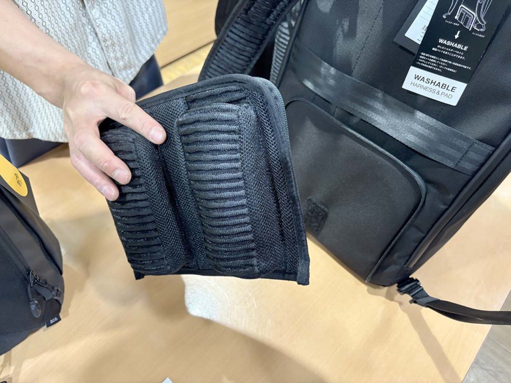さらに、夏の暑さ対策もバッチリ!ショルダーベルトには、高い吸湿性を誇るベルオアシス®という繊維を採用。背中部分には、サトウキビ由来の樹脂を配合したサステナブルな3Dクッションを使用しており、通気性をしっかり確保してくれます。背中とバッグの間にわずかな空間ができる設計になっているので、蒸れにくく、長時間背負っていても快適さが続きます。